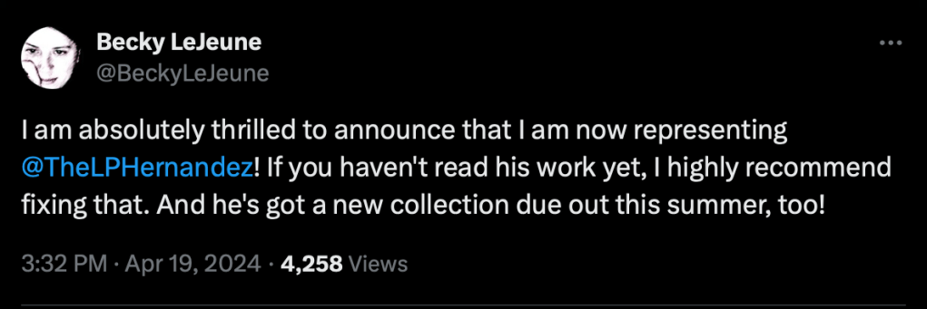 I weaned myself off Twitter in the past month. I check my account once a week in case Stephen King decided to DM to ask for a review copy of In the Valley of the Headless Men. (Have your people call my people) Both my Instagram and Threads accounts have 1/4 the followers I had on Twitter, and I was a pretty small fish to begin with. Most of my followers are authors stuck in the same place I am. Where do we go from here? There has not been an untainted social media platform since MySpace, and I’d hate to revive top 8 drama in this era.